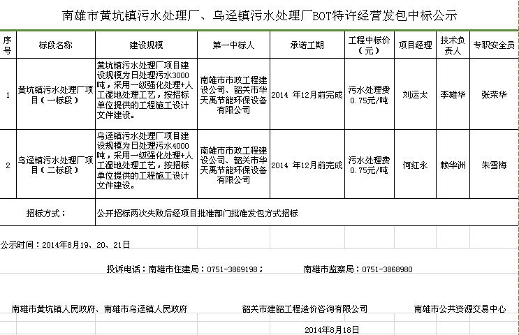 热烈祝贺公司在南雄市黄坑镇污水处理厂及乌迳镇污水处理厂BOT特许经营中投标成功!2014-08-20